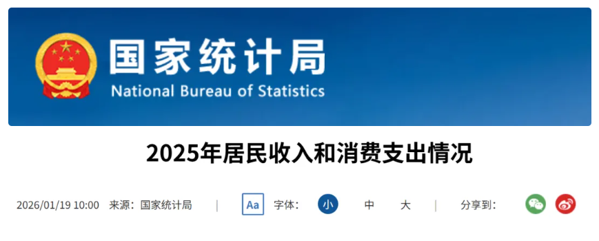 2026年1月19日上午10点,国务院新闻办公室举行2025年国民经济运行情况新闻发布会,国家统计局发布了2025年居民收入和消费支出情况。