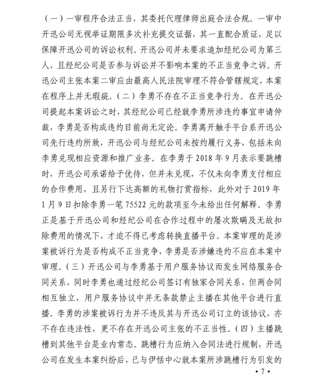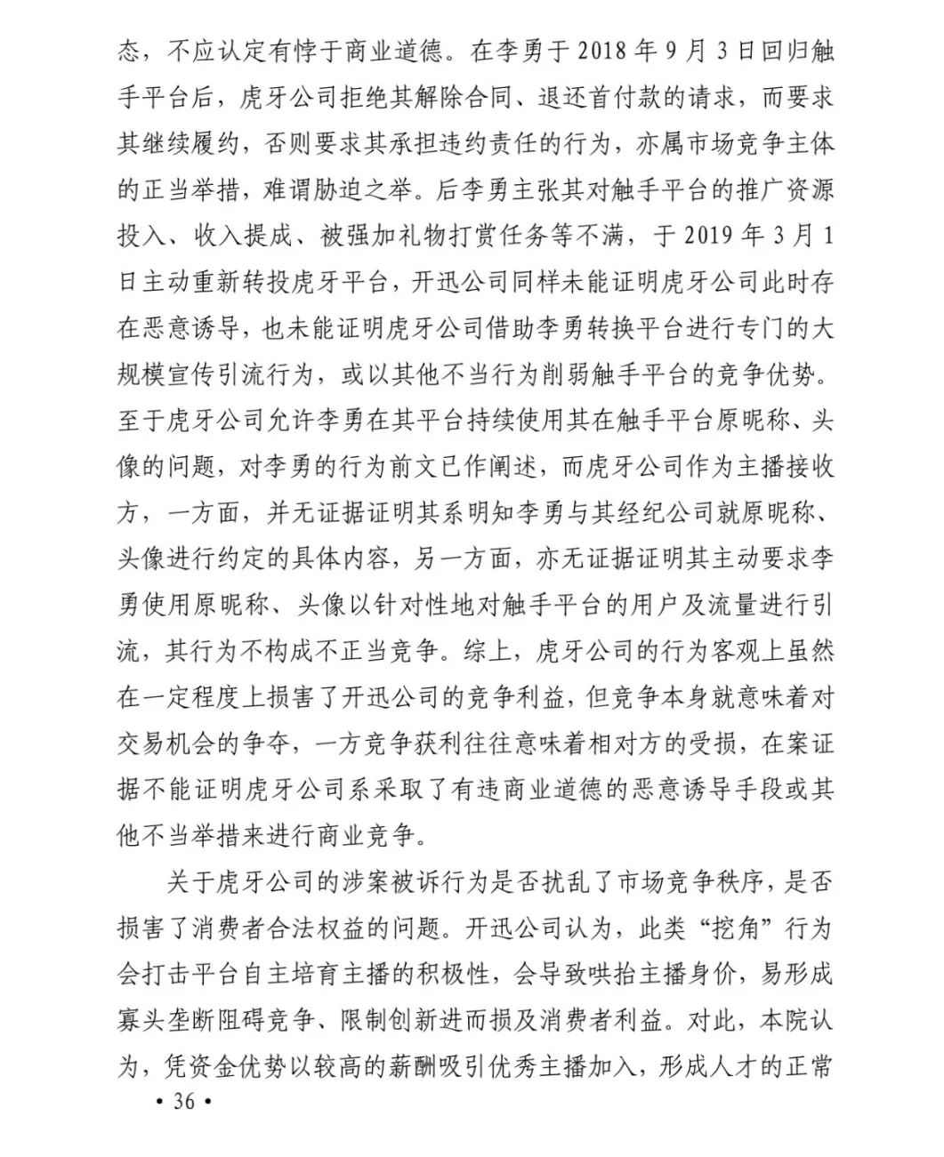 被上诉人虎牙公司答辩称争夺人才是行业竞争的正常手段,虎牙公司接纳李勇作为平台主播是正常的市场行为,并且开迅公司可以通过合同获得救济。昵称和头像由李勇创作,属于其个人信息,具有强烈的人格属性,与李勇密不可分,经纪公司无权通过格式条款的方式强行将之约定为其或第三人所有。